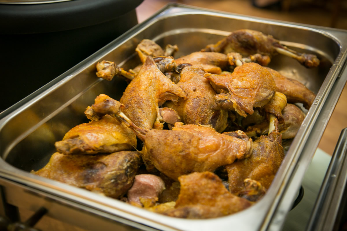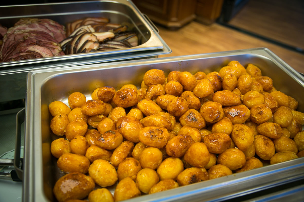 Es wurde serviert: Grünkohl mit Kasseler vom Schweinenacken, Kochwurst, Schweinebacke, Flugentenkeule, Bratkartoffeln und süße Kartoffeln.