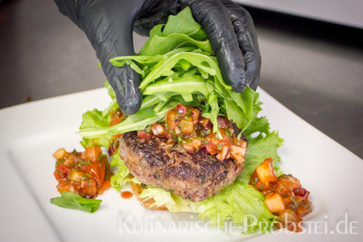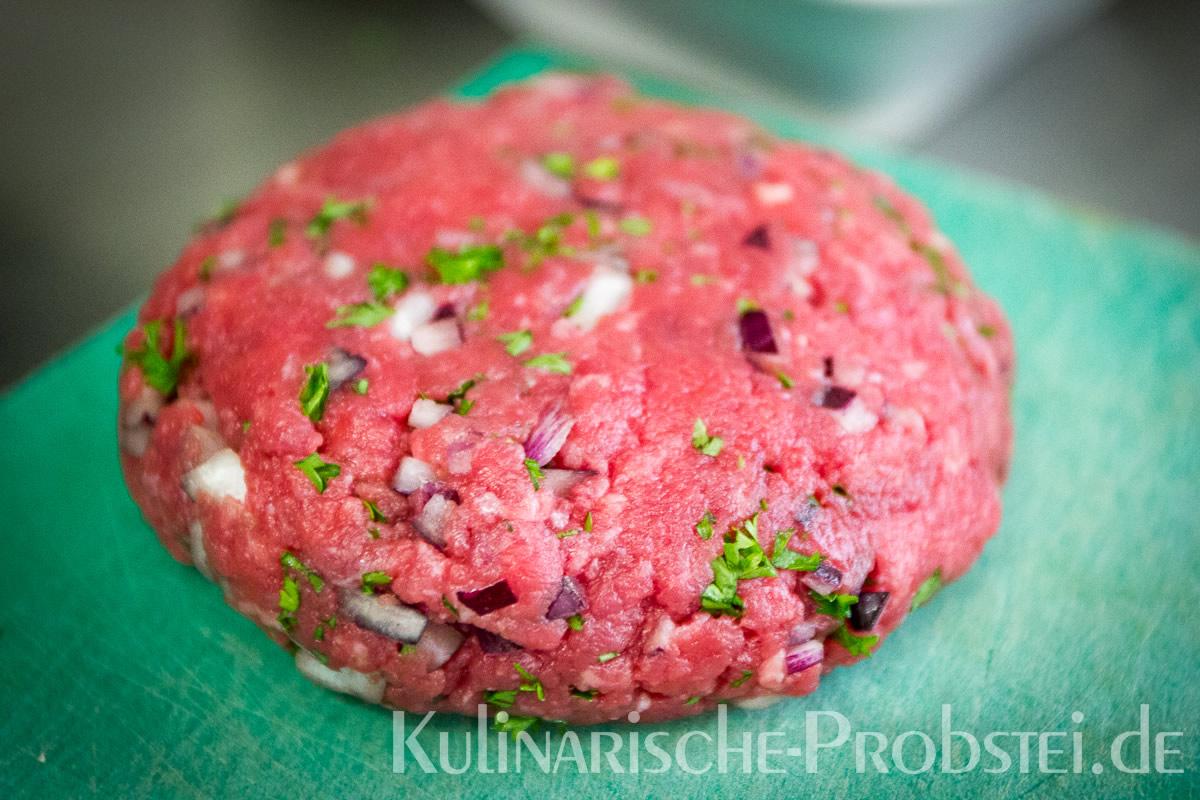 Er bestand aus bestem, mageren Fleisch von der Holsteiner Färse (wurde frisch durch den Wolf gedreht!), Tomaten, Gurken, Salat, Rucula, roten Zwiebeln, frischen Kräutern und Gewürzen, sowie Aioli und Tomatenrelish.