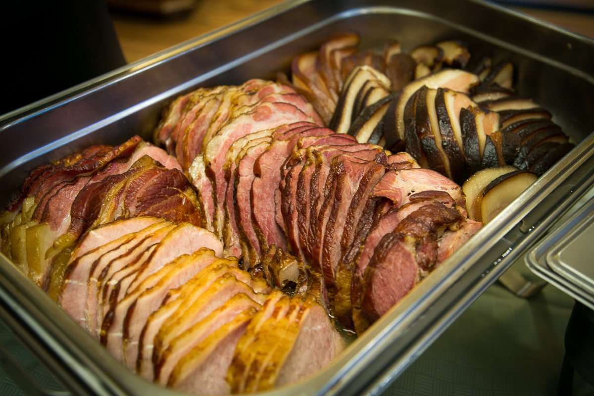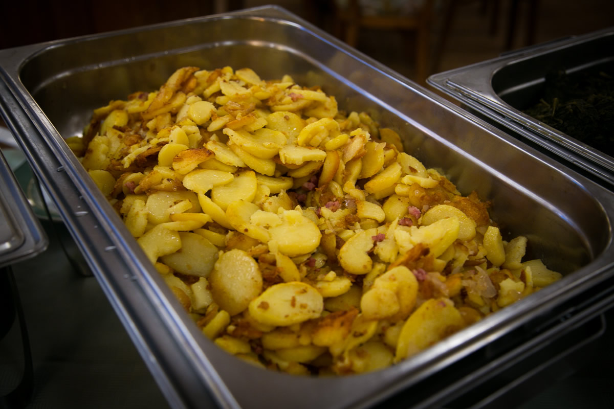 Es wurde serviert: Grünkohl mit Kasseler vom Schweinenacken, Kochwurst, Schweinebacke, Flugentenkeule, Bratkartoffeln und süße Kartoffeln.