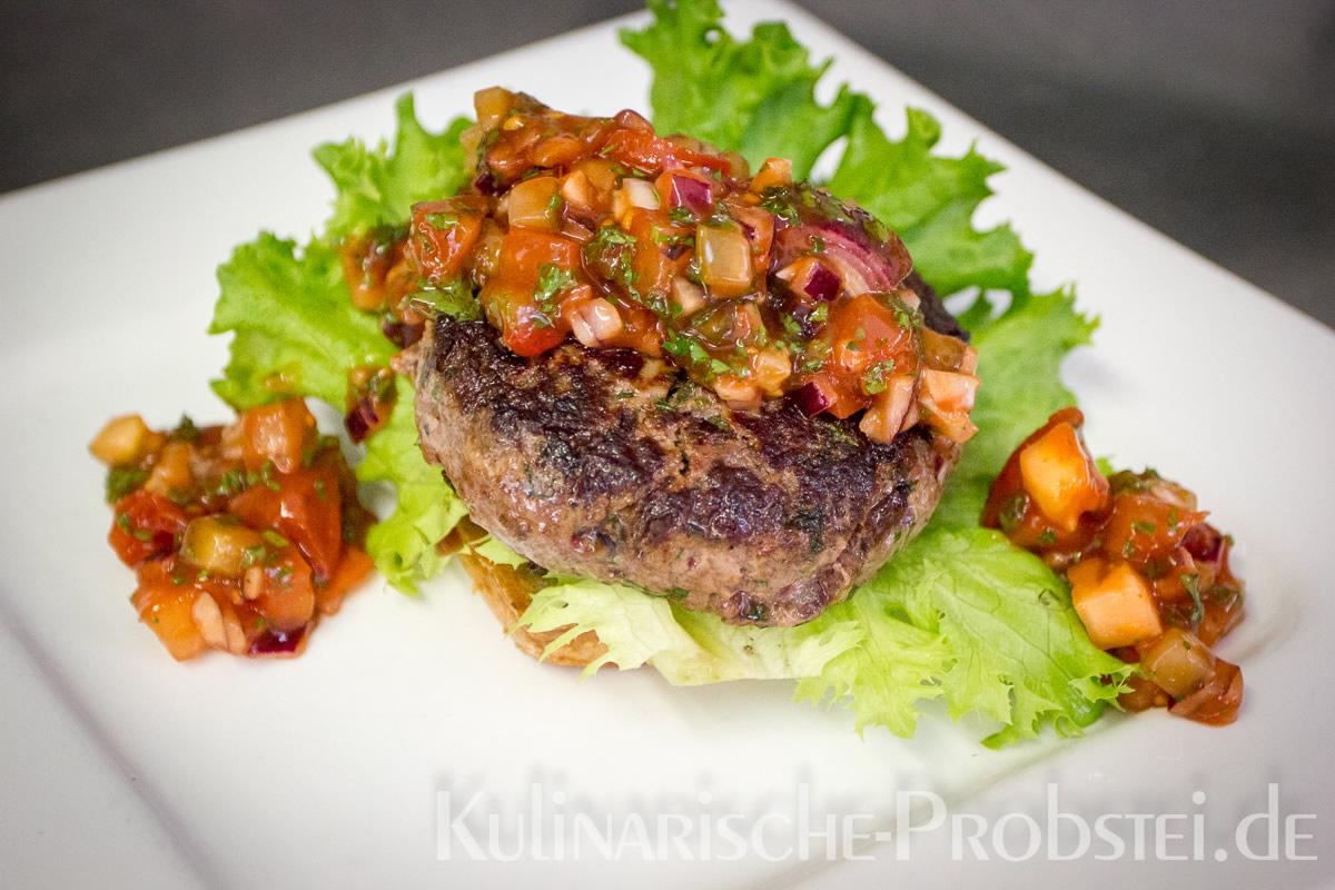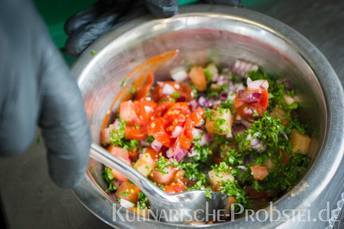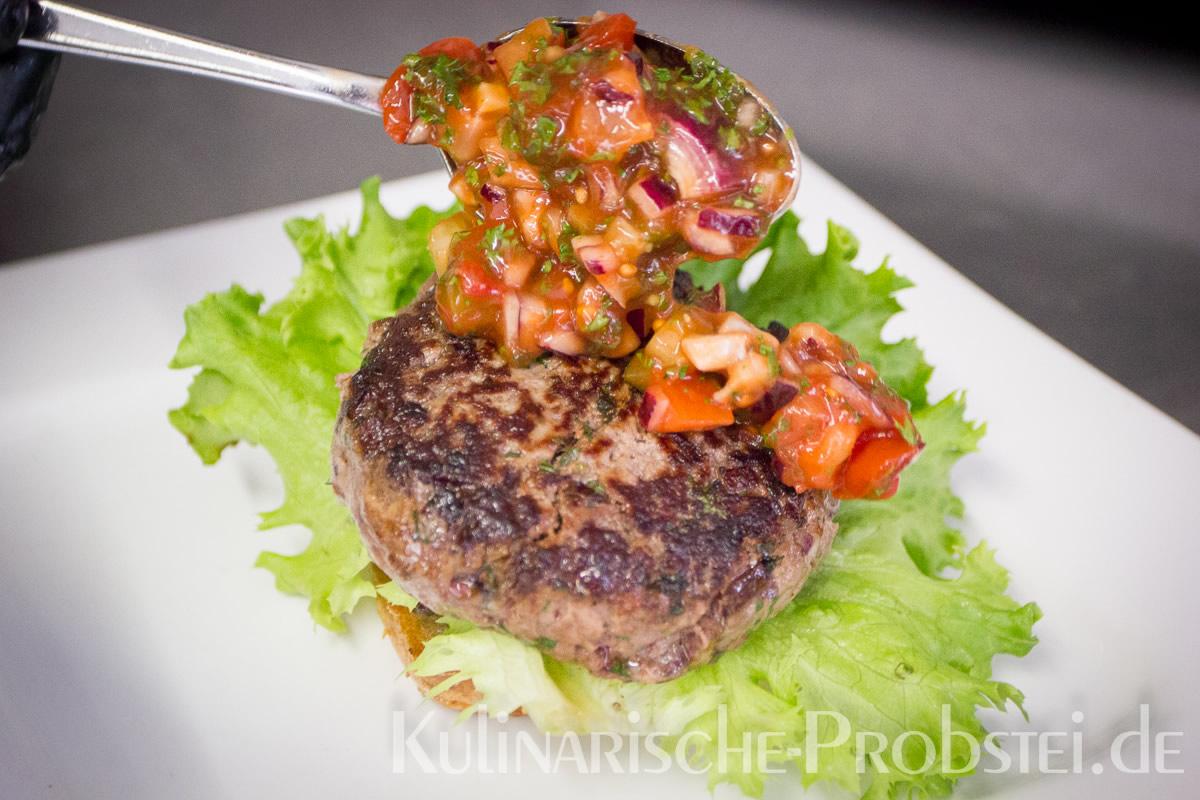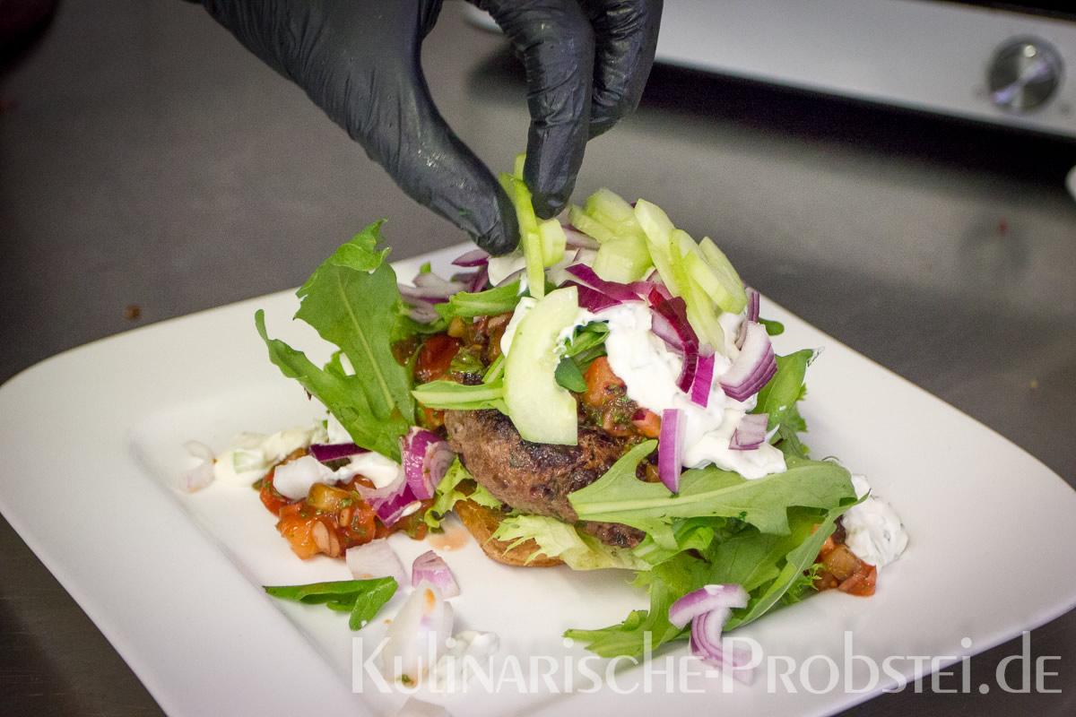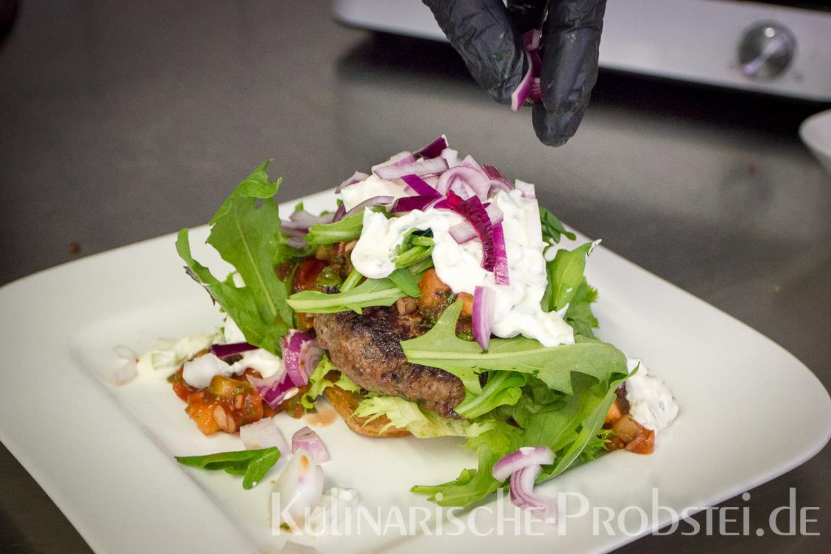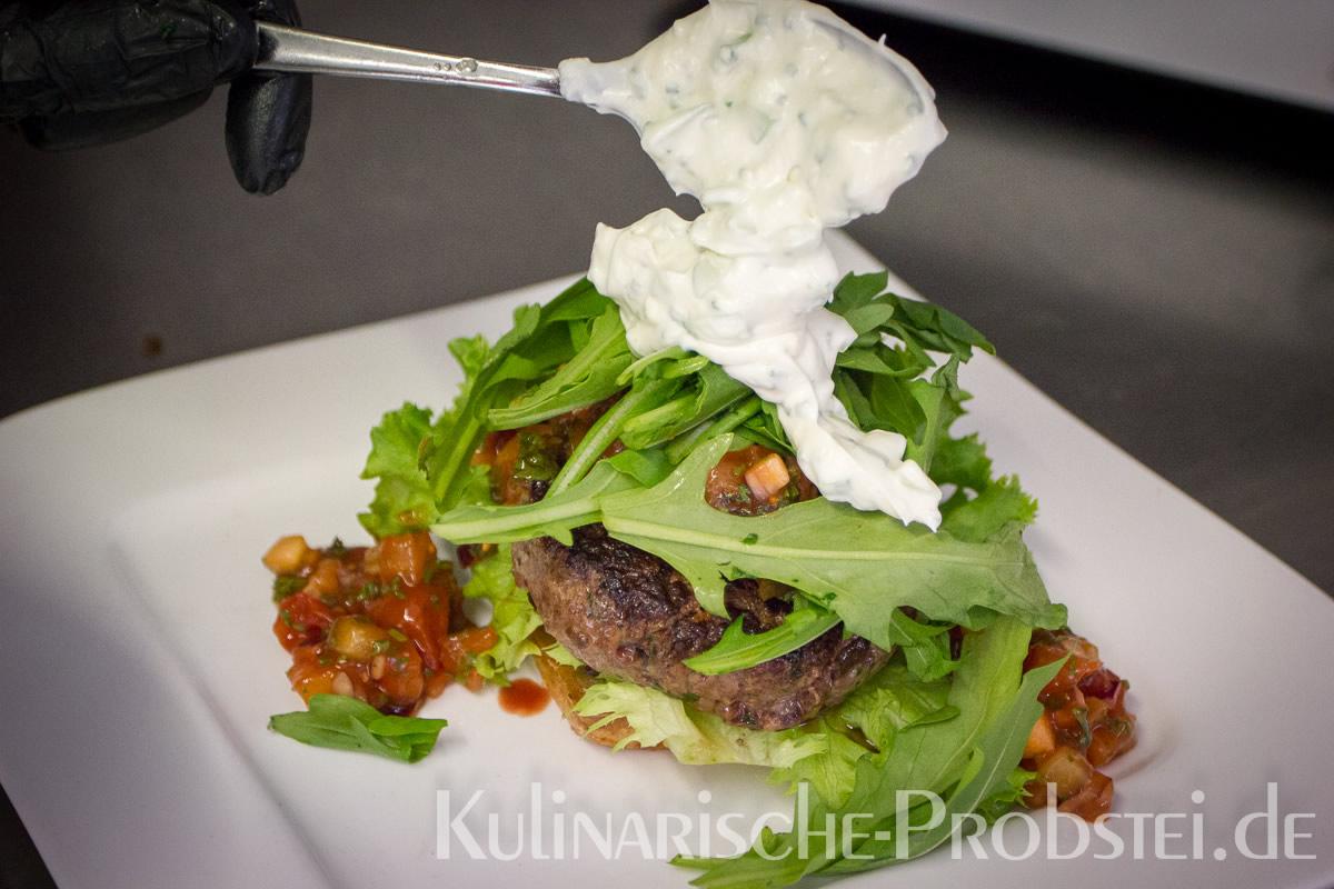 Er bestand aus bestem, mageren Fleisch von der Holsteiner Färse (wurde frisch durch den Wolf gedreht!), Tomaten, Gurken, Salat, Rucula, roten Zwiebeln, frischen Kräutern und Gewürzen, sowie Aioli und Tomatenrelish.