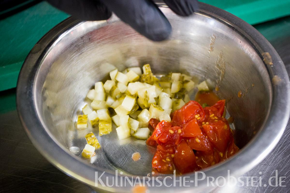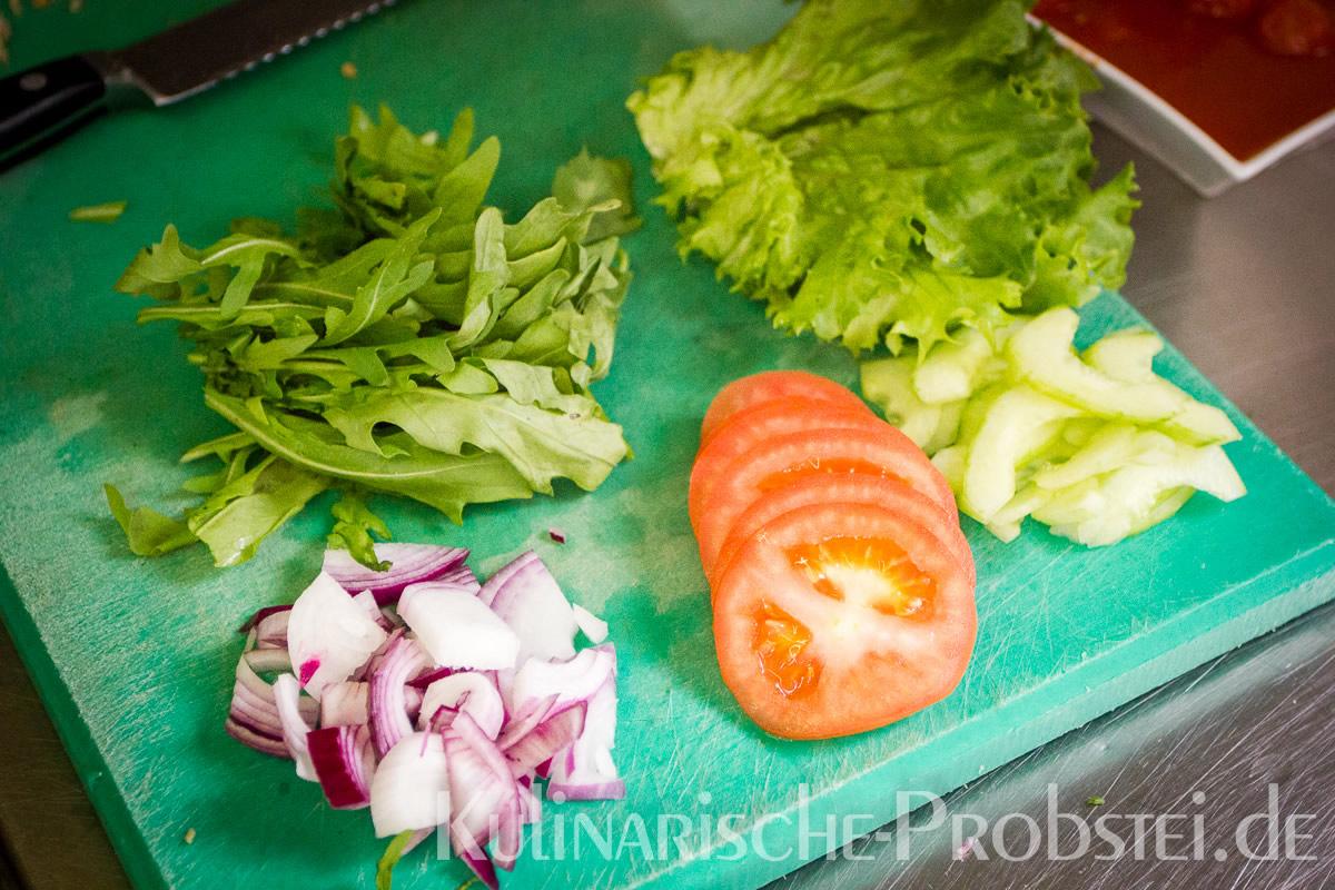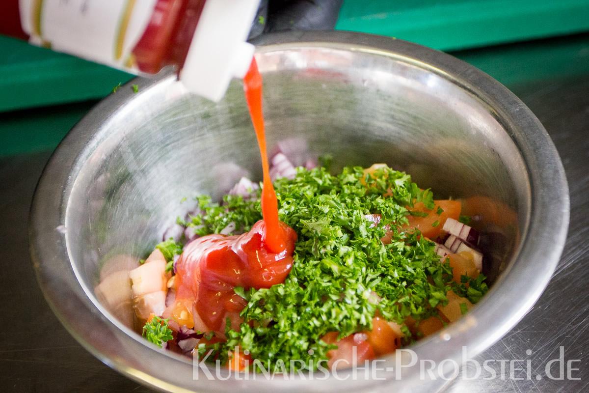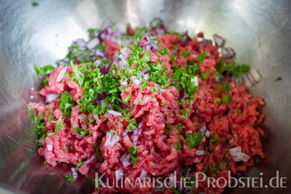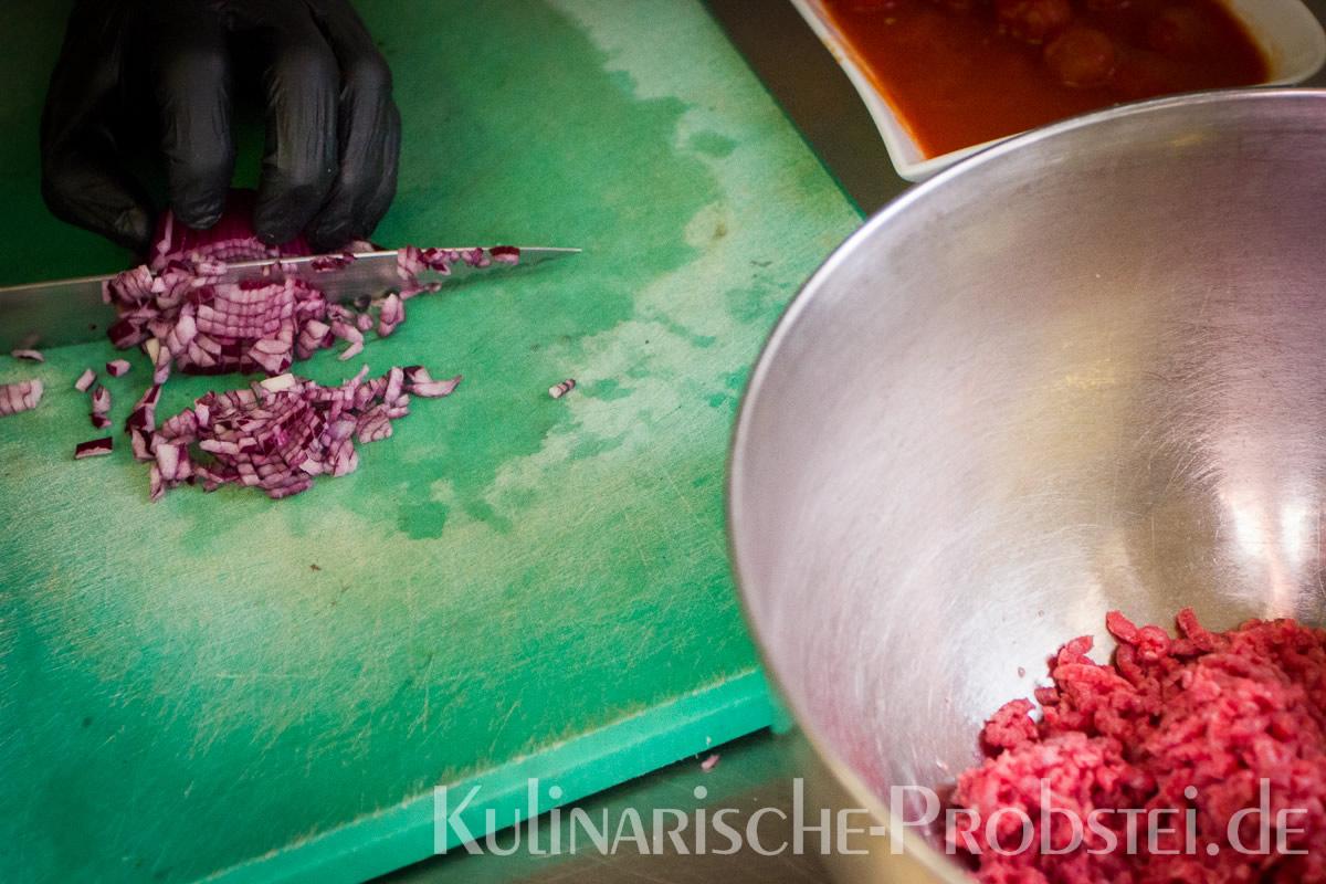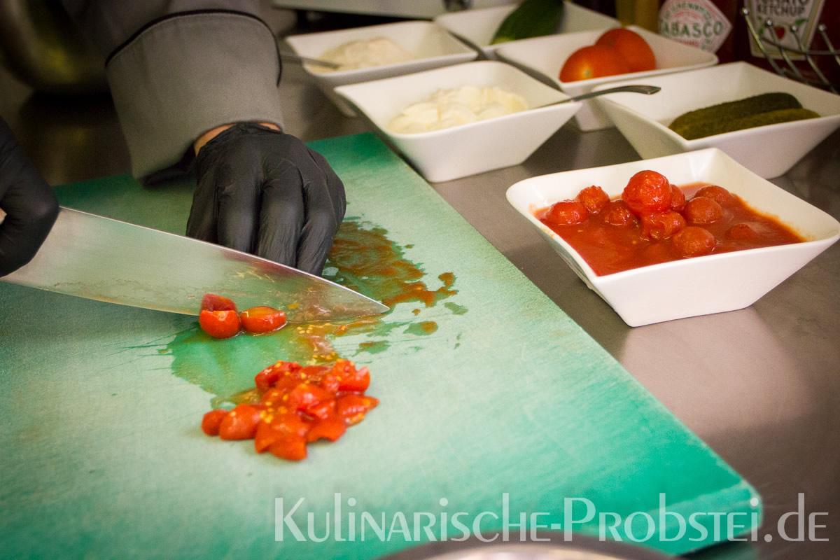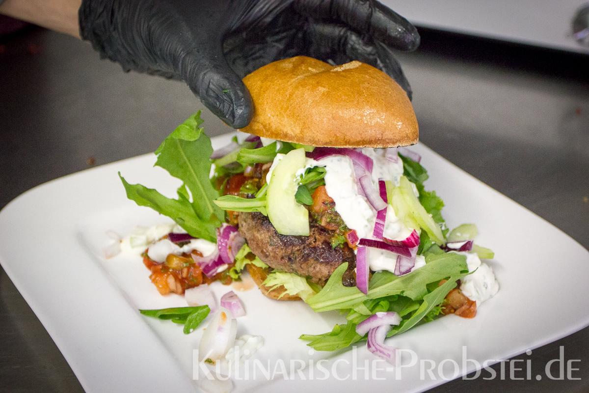 Er bestand aus bestem, mageren Fleisch von der Holsteiner Färse (wurde frisch durch den Wolf gedreht!), Tomaten, Gurken, Salat, Rucula, roten Zwiebeln, frischen Kräutern und Gewürzen, sowie Aioli und Tomatenrelish.