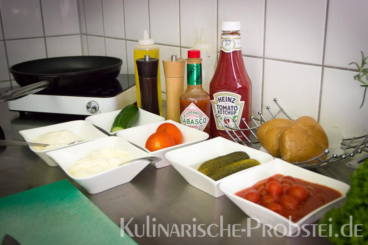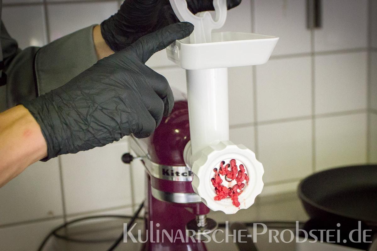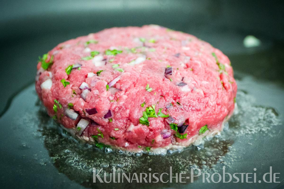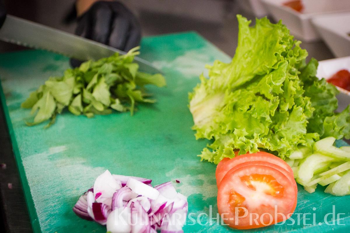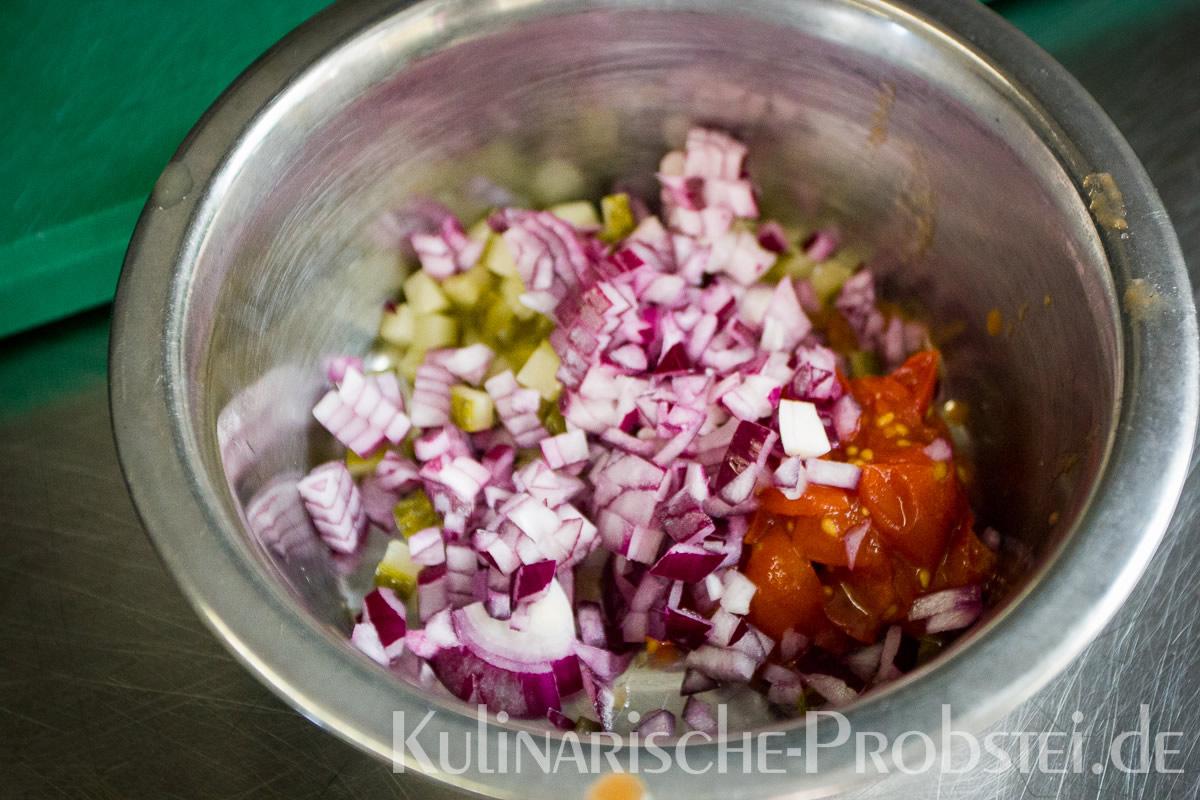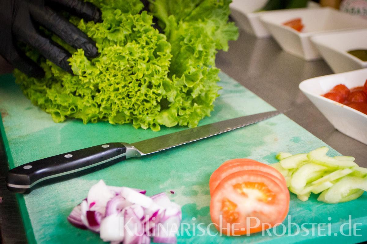 Er bestand aus bestem, mageren Fleisch von der Holsteiner Färse (wurde frisch durch den Wolf gedreht!), Tomaten, Gurken, Salat, Rucula, roten Zwiebeln, frischen Kräutern und Gewürzen, sowie Aioli und Tomatenrelish.