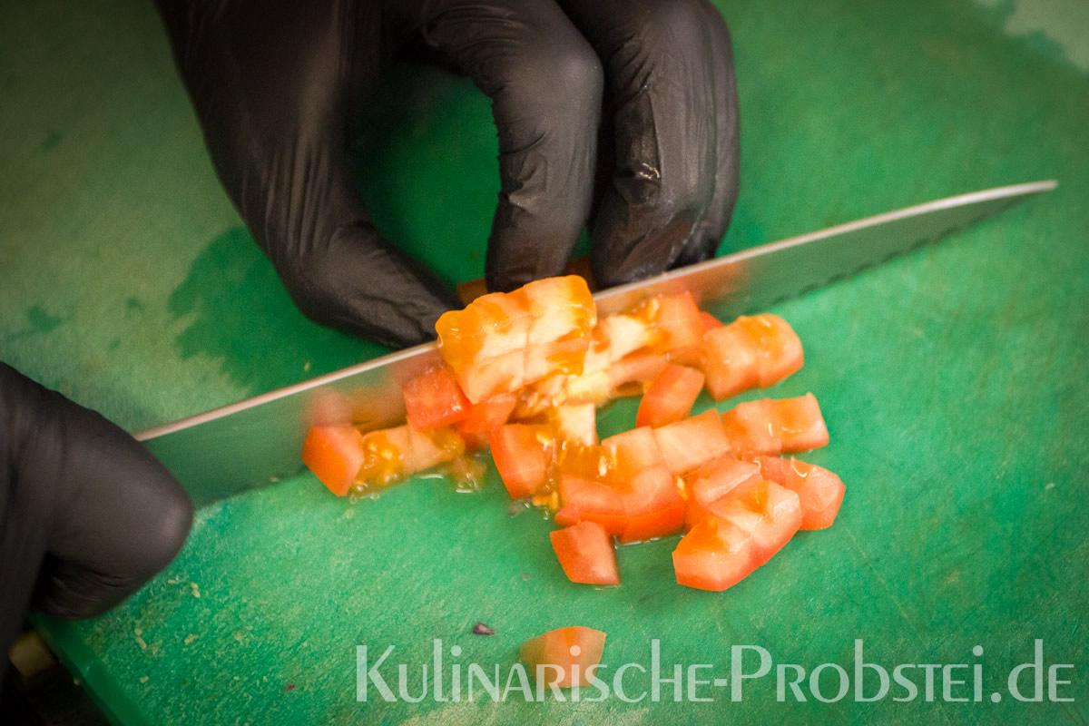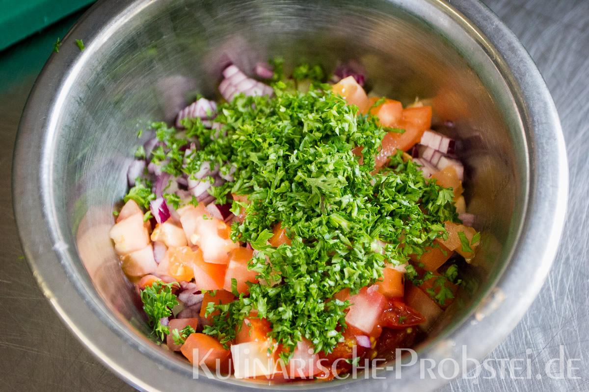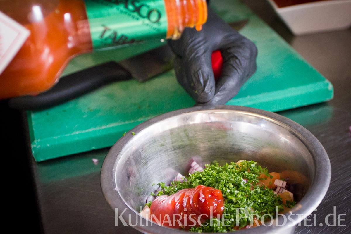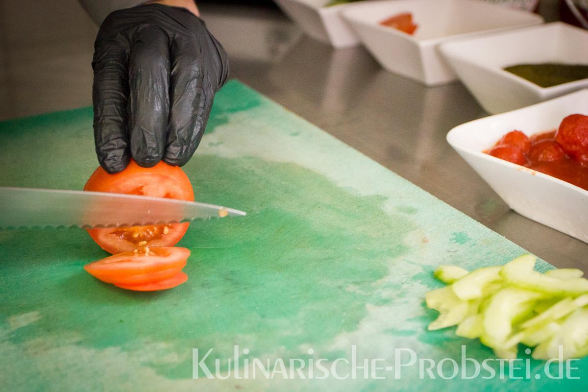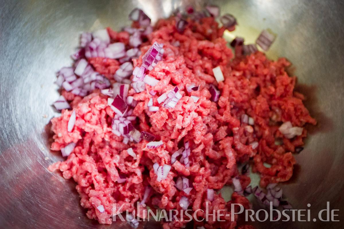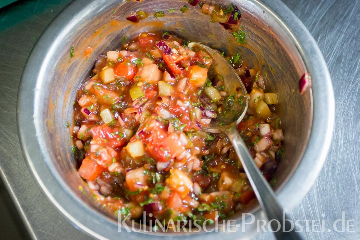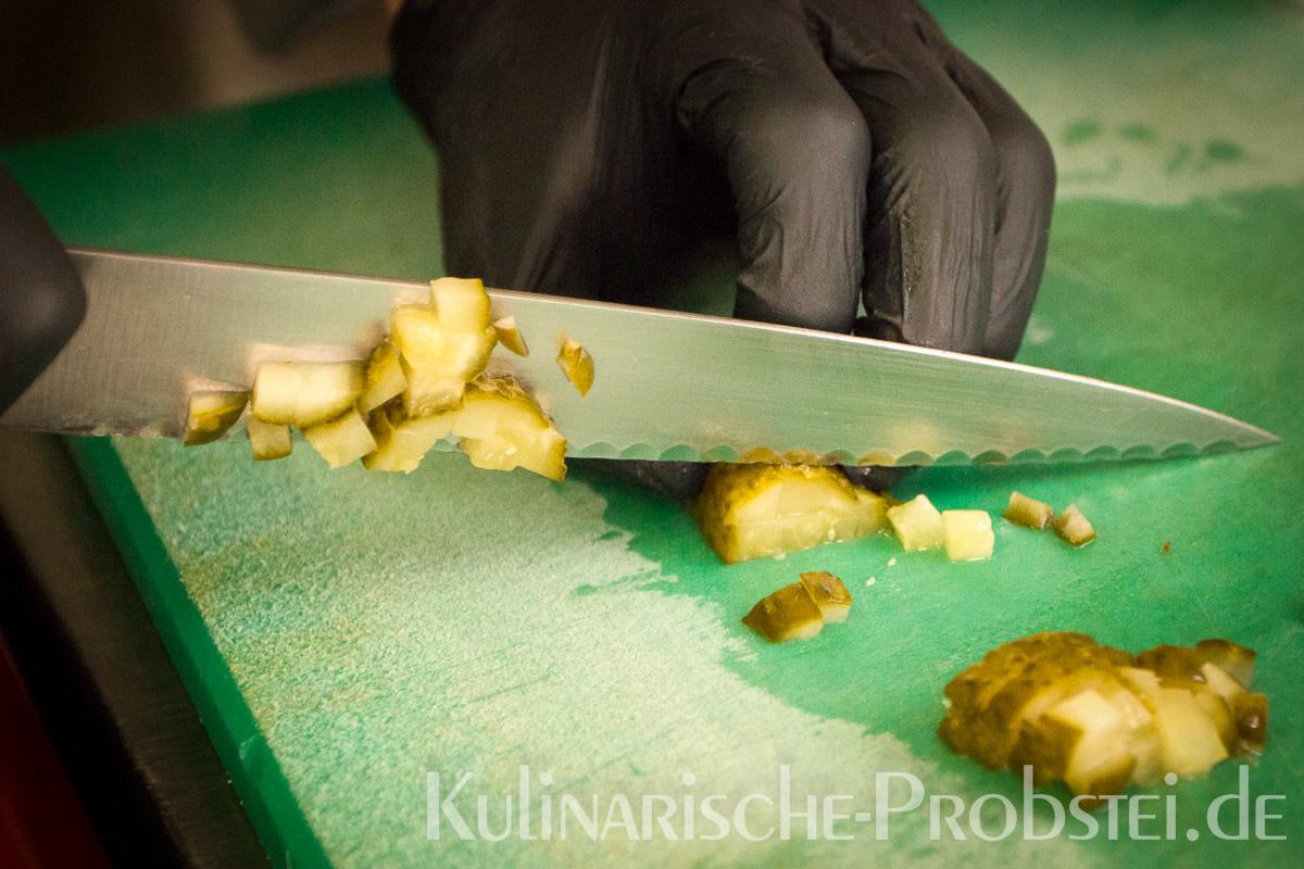 Er bestand aus bestem, mageren Fleisch von der Holsteiner Färse (wurde frisch durch den Wolf gedreht!), Tomaten, Gurken, Salat, Rucula, roten Zwiebeln, frischen Kräutern und Gewürzen, sowie Aioli und Tomatenrelish.